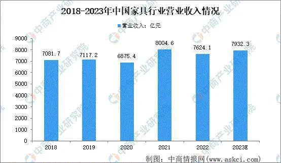 數(shù)據(jù)顯示,2022年受疫情和外貿(mào)等因素影響,我國家具行業(yè)規(guī)模以上企業(yè)實(shí)現(xiàn)營業(yè)務(wù)收入7624.1億元,同比下降-4.8%?;仡?018-2022年家具制造業(yè)營業(yè)收入情況:近年來,我國家具制造業(yè)營業(yè)收入總體呈小幅度下降趨勢,預(yù)計(jì)2023年我國家具行業(yè)復(fù)蘇營業(yè)收入將達(dá)7932.3億元。