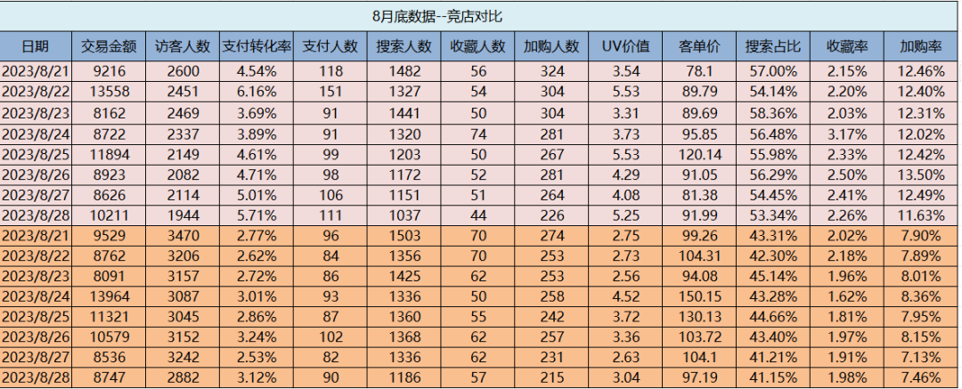 “了解競店的爆款產(chǎn)品,進行數(shù)據(jù)對比。因為各個店鋪結(jié)構(gòu)的不同,我們會進行對應(yīng)的改變,使用差異化競爭?!惫鉃嬖V我們,“每周競店數(shù)據(jù)進行對比,持續(xù)感知競店的實時動向,避免運營品牌店鋪被超越?!?/span>