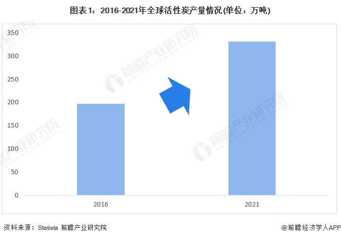 隨著全球活性炭技術(shù)的不斷發(fā)展,活性炭行業(yè)產(chǎn)能迅速增加。公眾對健康問題的重視,助推活性炭產(chǎn)能逐年遞增。Statista數(shù)據(jù)顯示,全球活性炭總產(chǎn)量已從2016年的196.2萬噸,增長到2021年的331.1萬噸。