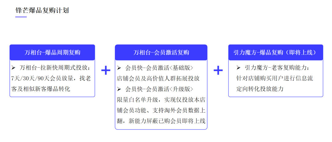 第二,萬相臺拉新快周期復(fù)購,實現(xiàn)老客、高潛客戶周期轉(zhuǎn)化。幫助爆品復(fù)購生意驅(qū)動型食品商家,智能定向周期復(fù)購人群,多資源位投放轉(zhuǎn)化,抓住復(fù)購生意機會。