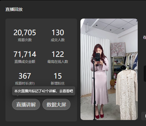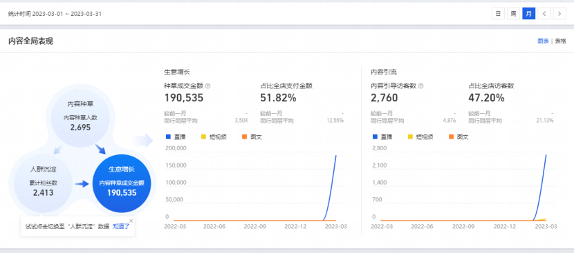女裝店鋪面對(duì)廣大女性用戶,這一群體對(duì)愛美有著極大的興趣,而抖音直播間(興趣電商)的搭建,恰好為李萌(化名)的女裝店鋪提供了一個(gè)絕佳的流量通道,于是火蝠幫助李萌重新優(yōu)化直播間的裝修風(fēng)格,直播節(jié)奏,以及內(nèi)容話術(shù)來(lái)吸引消費(fèi)人群,助力女裝店鋪完成沖刺目標(biāo)從而實(shí)現(xiàn)彎道超車,最終在直播賽道取得矚目成績(jī),內(nèi)容種草2695人,累計(jì)粉絲數(shù)2413,直播成交19萬(wàn)。
