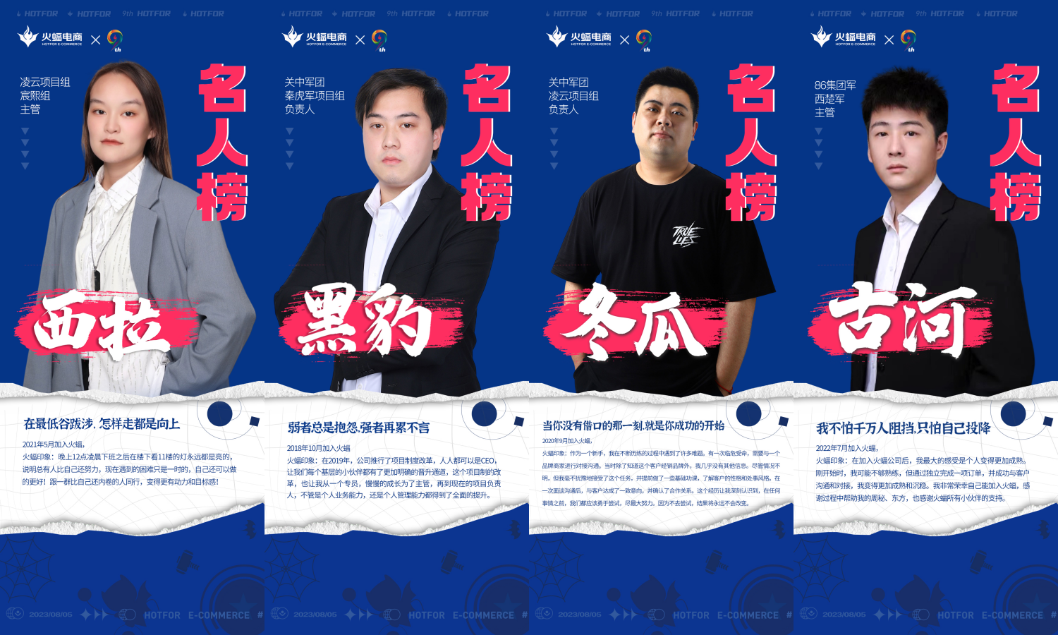 當(dāng)日下午兩點,慶典正式拉開帷幕。現(xiàn)場布置精美,名人榜、簽到墻清晰地展現(xiàn)了該企業(yè)九年的光輝歷程與成就。走進(jìn)會場,最引人注目的莫過于巨幅「名人榜」海報?!复藭r此刻,非我莫屬」「天生我材必有用」「因為相信,所以看見」......上面標(biāo)注著「人生格言」與「名人事跡」。英姿颯爽的面容、炯炯有神的雙目,通過不懈努力,從普通員工一路成長為項目負(fù)責(zé)人/主管,他們是來自于設(shè)計、銷售、運營等各版塊的杰出代表,也是火蝠電商發(fā)展的中流砥柱。值得注意的是,不少女員工也赫然位列「名人榜」上,摒棄性別偏見,以成績論英雄,在這個大舞臺上,任何人都施展拳腳的機(jī)會。這也表明公司CEO鐘雨清先生對人才的高度重視,注重人才的均衡培養(yǎng),并將其擺在企業(yè)發(fā)展的核心位置。