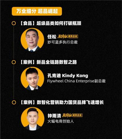 具體而言,在“萬(wàn)店連鎖·零售復(fù)興”維度,面對(duì)電商換擋期,如何洞察消費(fèi)趨勢(shì)?如何打爆細(xì)分賽道超級(jí)單品??jī)|邦動(dòng)力總裁賈鵬雷、火蝠電商CEO鐘雨清等人將發(fā)表演講。圍繞數(shù)智化營(yíng)銷助力國(guó)貨品牌飛速增長(zhǎng)、超級(jí)品類如何打破瓶頸、新品全鏈路數(shù)智之路等熱點(diǎn)話題,共同探尋新零售下各品類的崛起之路。