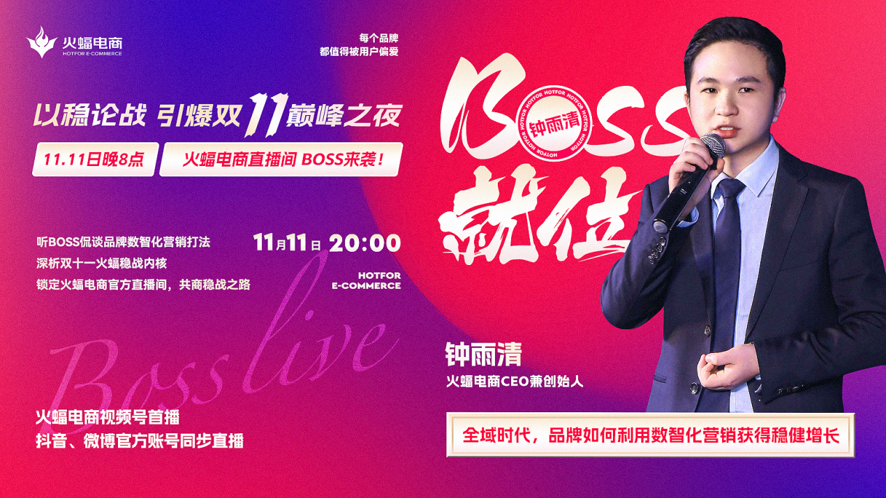 11月11日晚8點,敬請關(guān)注火蝠電商視頻號官方直播間,與火蝠電商CEO鐘雨清一起「穩(wěn)戰(zhàn)」破局,引爆雙十一巔峰之夜。