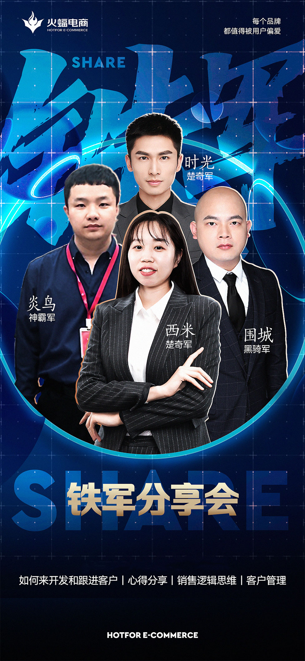 為提高一線作戰(zhàn)能力和理論水平,打造一支勇于創(chuàng)新、能堪當(dāng)重任的鐵軍隊(duì)伍。近期,火蝠電商市場部于線上舉辦了鐵軍分享會。武漢總部,杭州分部與廣州分部的兄弟團(tuán)們,在交流學(xué)習(xí)中又碰撞出了怎樣的火花呢?